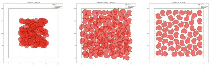 The intuition is to put more objects in and delete from that. The core idea is to overestimate the number of objects that can fit in the build plate, then use physical simulation to let the objects settle into a stable configuration. Then we iteratively remove the objects with the most overlap area, shake, let it settle again, until there is no overlap. The implementation is done in Python, using the Pymunk physics simulation package (Blomqvist 2025).