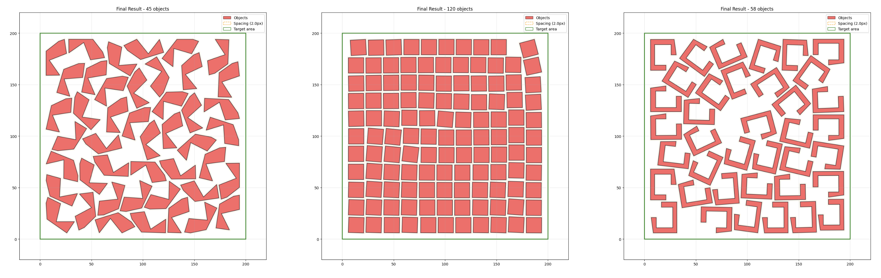 As we can see from the examples, the physical simulation-based algorithm works well for both irregular and regular shapes. For not too concave irregular shapes (left), the packing efficiency is decent, although there seems to be room for another one or two shapes.